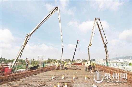 福厦客专5标跨驿峰西路特大桥在泉港区境内,全长1.4公里,其上跨驿峰西路段落采用(40+72+40)米预应力混凝土连续梁的结构设计形式。浇筑现场,两台混凝土泵车双管齐下,源源不断地将混凝土浇筑进已经架设好的钢箱梁模板内,一旁的工人们迅速将混凝土推平、振捣,现场技术员则时时盯着,把控混凝土质量和振捣质量等。首段箱梁总共需要浇筑701.9方C50型混凝土,为了保证浇筑质量,需要20名工人连续浇筑15小时。