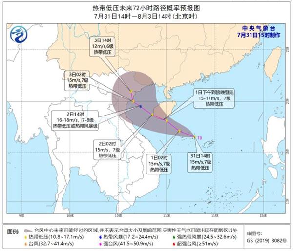 今天(7月31日)下午,南海扰动加强为热带低压,目前该热带低压中心最大风力15米/秒,风力7级,中心位于距离海南省三亚市东偏南方向约440公里的海面上,将以每小时21公里左右的速度向西偏北方向移动。