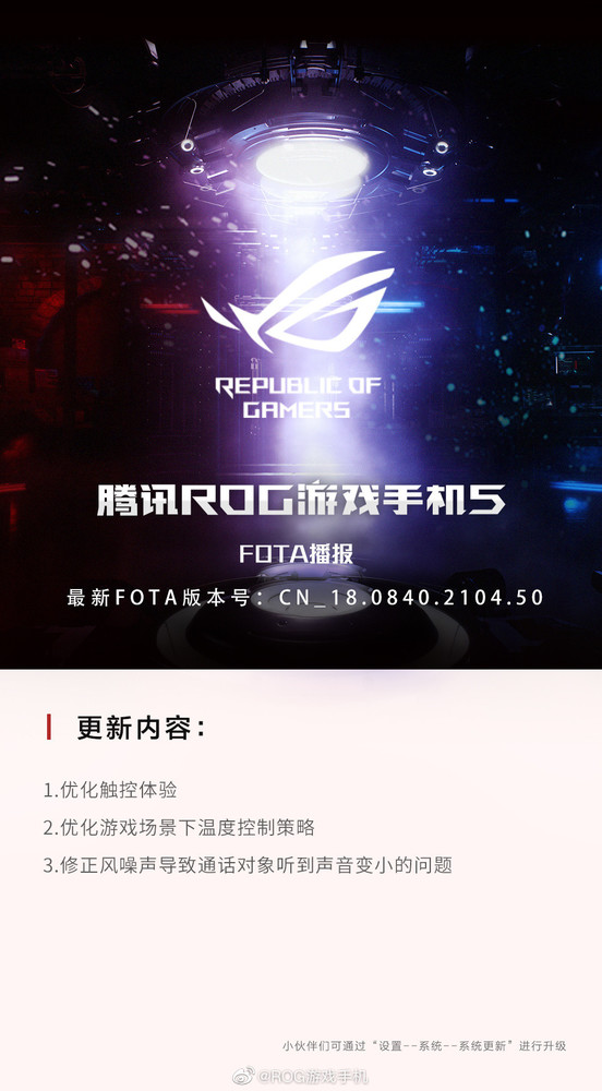 6月4日,ROG游戏手机官方宣布,腾讯ROG游戏手机5新版系统更新,此次更新内容包括:优化触控体验;优化游戏场景下温度控制策略;修正风噪声导致通话对象听到声音变小的问题。用户可通过“设置-系统-系统更新”进行升级。