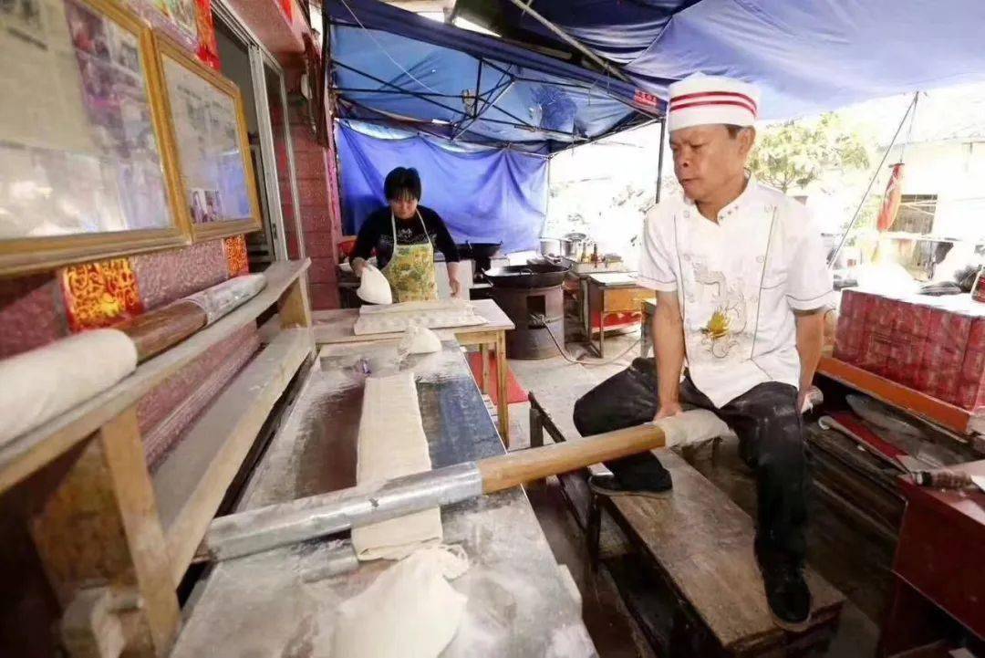 屁股面是蓬华的传统特色美食,据说起源于清朝。这种面制作工序不同于其他面条,首先是用上等面粉和面碱,用温水和盐搅拌,揉成面团。揉面也有讲究, 力道要大,放的面粉不能太多。面团放在一张桌面厚达七八厘米的桌子上,上方多了道横杆,用来抵住擀面棍;桌底下压满大石头,防止跳动时桌子不稳。面桌,支起擀面杖开始跳动。擀面桌和大擀面杠子都是特制的,杠子长约 1.2 米, 有碗粗,一端套进案板上的木制横杆里,另一端则骑在胯下。杠子下放着一大块面团,一边跳动,一边以凹槽为中心,左右不停地擀压面团。几个来回,一大块面团就被压成扁条形。面皮按 10 厘米左右的宽度来回摞折,然后用菜刀将面皮切成细丝。