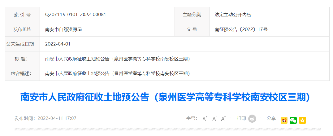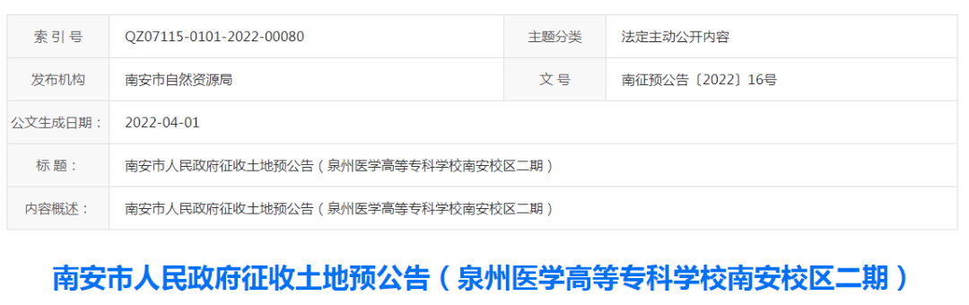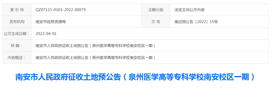 4月1日,南安市自然资源局发布了关于泉州医学高等专科学校南安校区一期、二期、三期的土地征收公告。