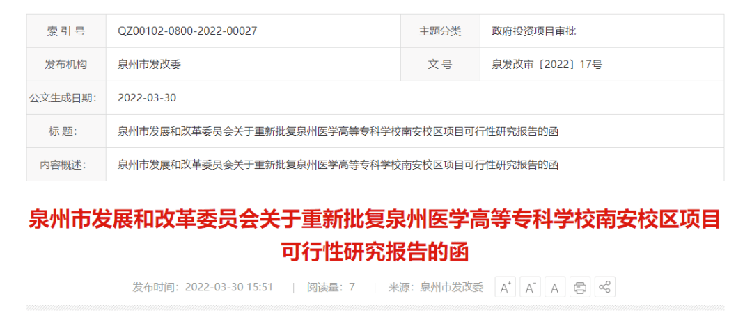 2022年3月30日,泉州市发改委重新批复《泉州医学高等专科学校南安校区项目可行性研究报告》。