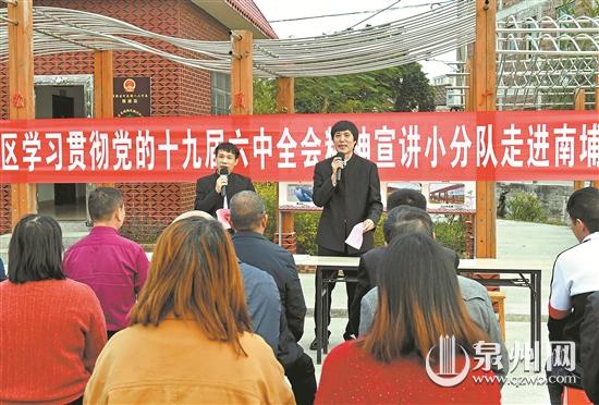 在南埔镇凤翔村田野公园,学习贯彻党的十九届六中全会精神宣讲小分队成员火热开讲