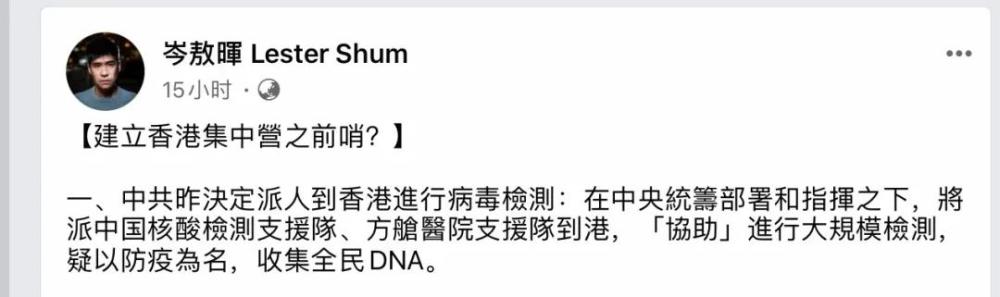另据最新消息,港府发言人表示,留意到有人在网上故意散播谣言,指在市民进行的病毒检测中,政府会将市民的基因资料送往内地,政府澄清绝无此事。